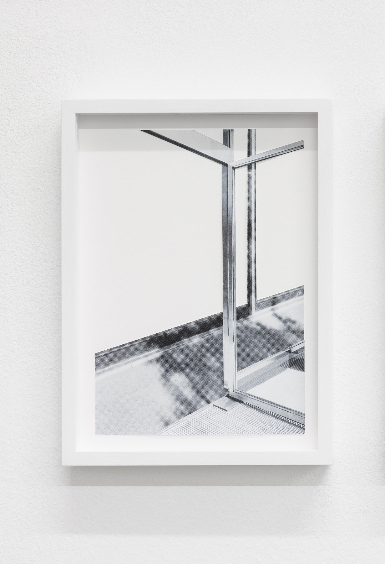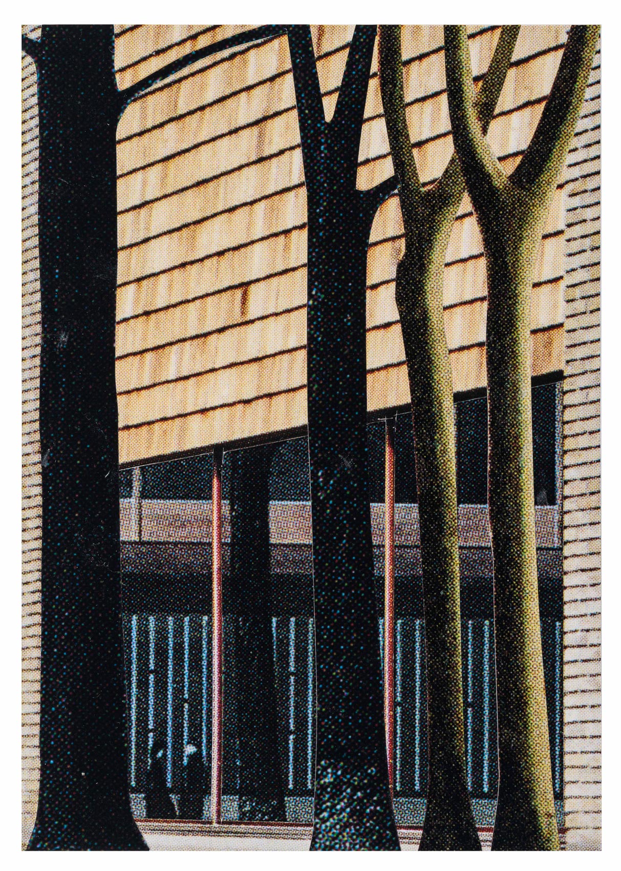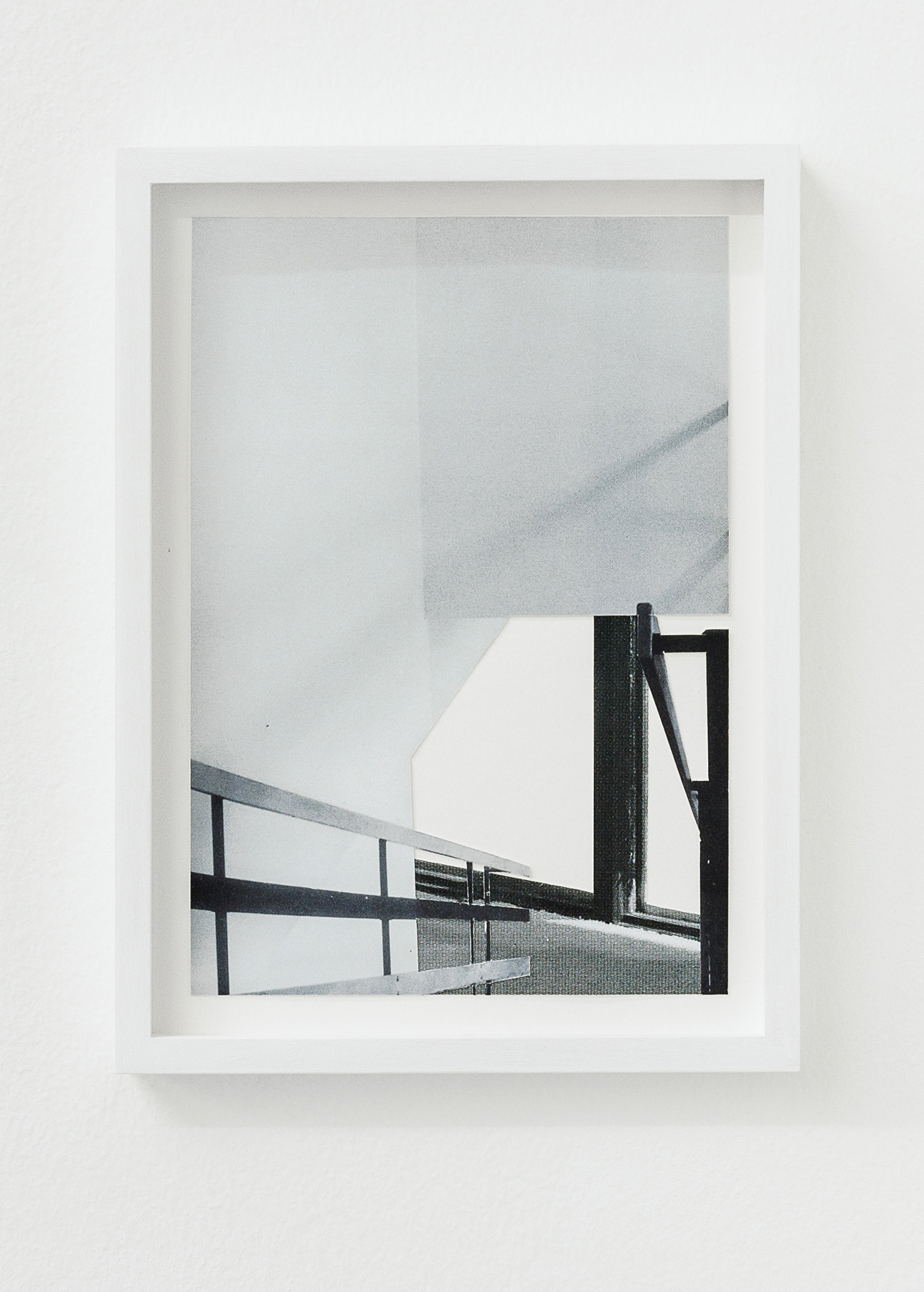 In a series of works titled after Google’s suggestion, the collages are composed of only two elements — one from a building by Richard Neutra and one from a building by Roland Rainer. As both Neutra and Rainer worked within a modernist tradition, the collages can at first glance appear to be a single, unified space — a space created by one architect. This effect is echoed by the removal of all contextual elements, leaving the collaged spaces to exist on their own, floating in a “neutrality” of nothingness.