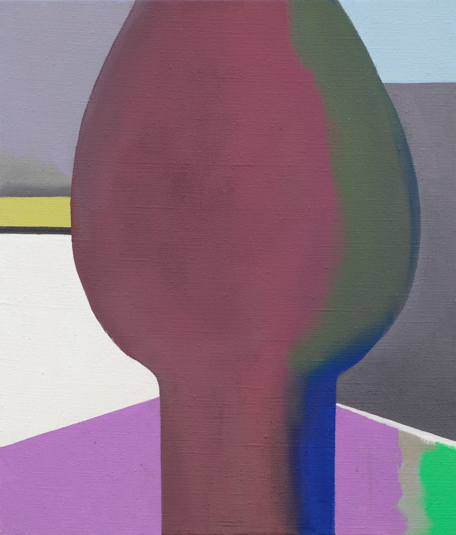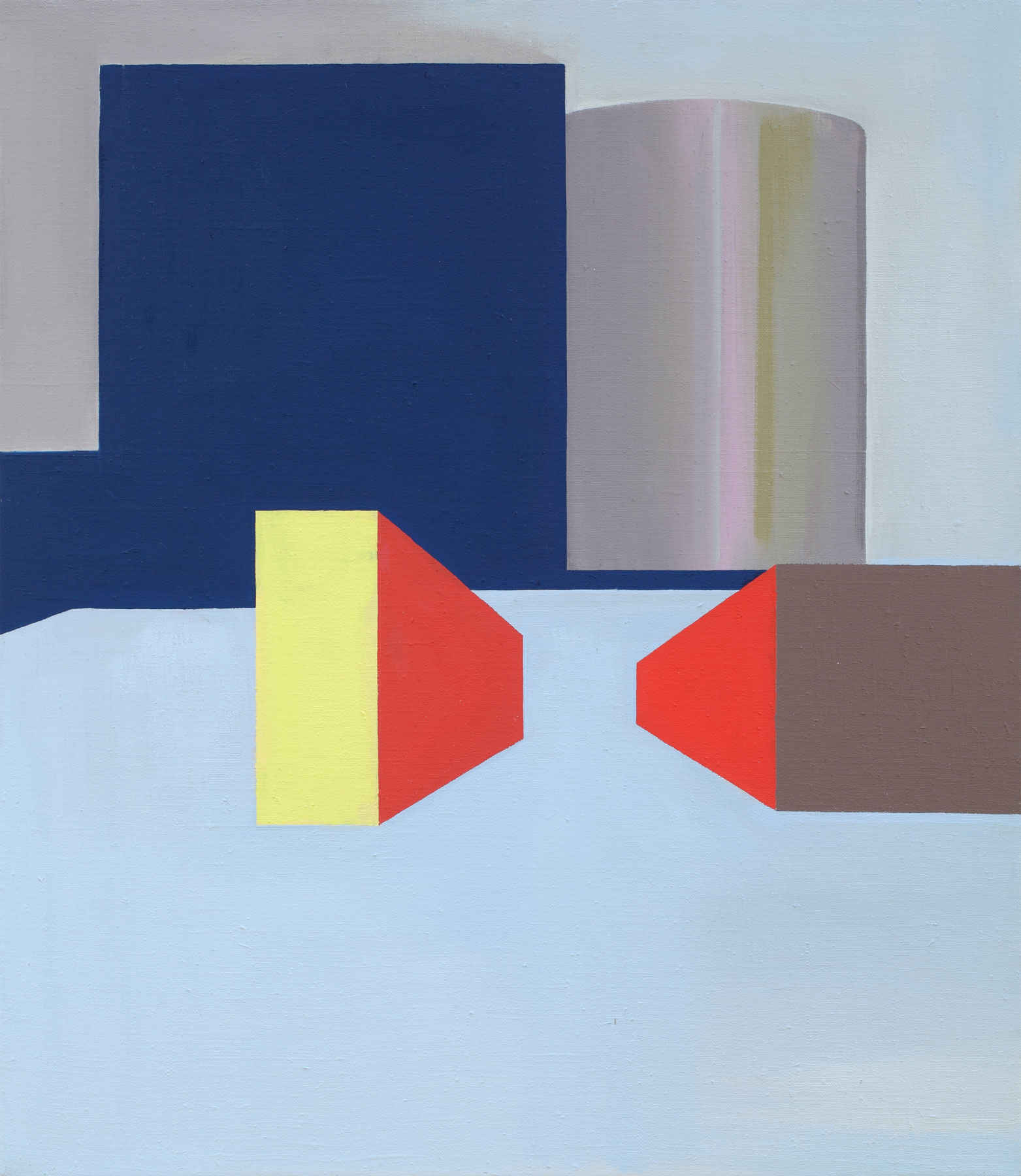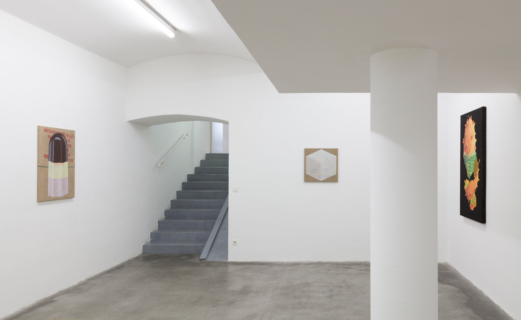 In Jan Merta’s works the technique of painting comes to the fore. He places transparent everyday objects — which seem to dissolve in his brushstrokes — or architectonic fragments in front of monochrome backgrounds that are divided into individual colour fields. He dismisses the clear separation of a central object against a background in favour of a multi-layered permeation of both levels. The objects in the images become visible only by taking a good look.