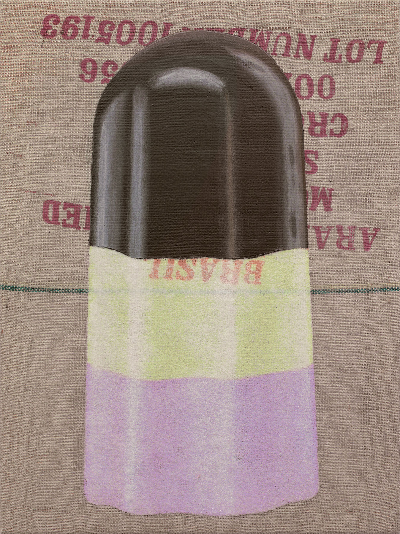 In her most recent paintings Maja Vukoje explores the question of what an image represents in terms of its materiality and which illusion it creates. She also draws from a range of everyday products as motifs while the global exchange of goods is the central topic of her work. By using materials foreign to painting, such as sugar, and by painting on burlap, she makes the content and form of her exploration overlap.
