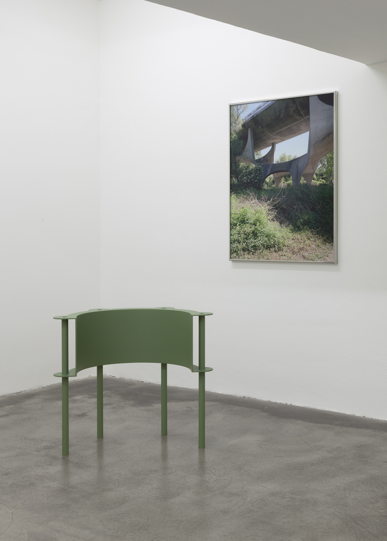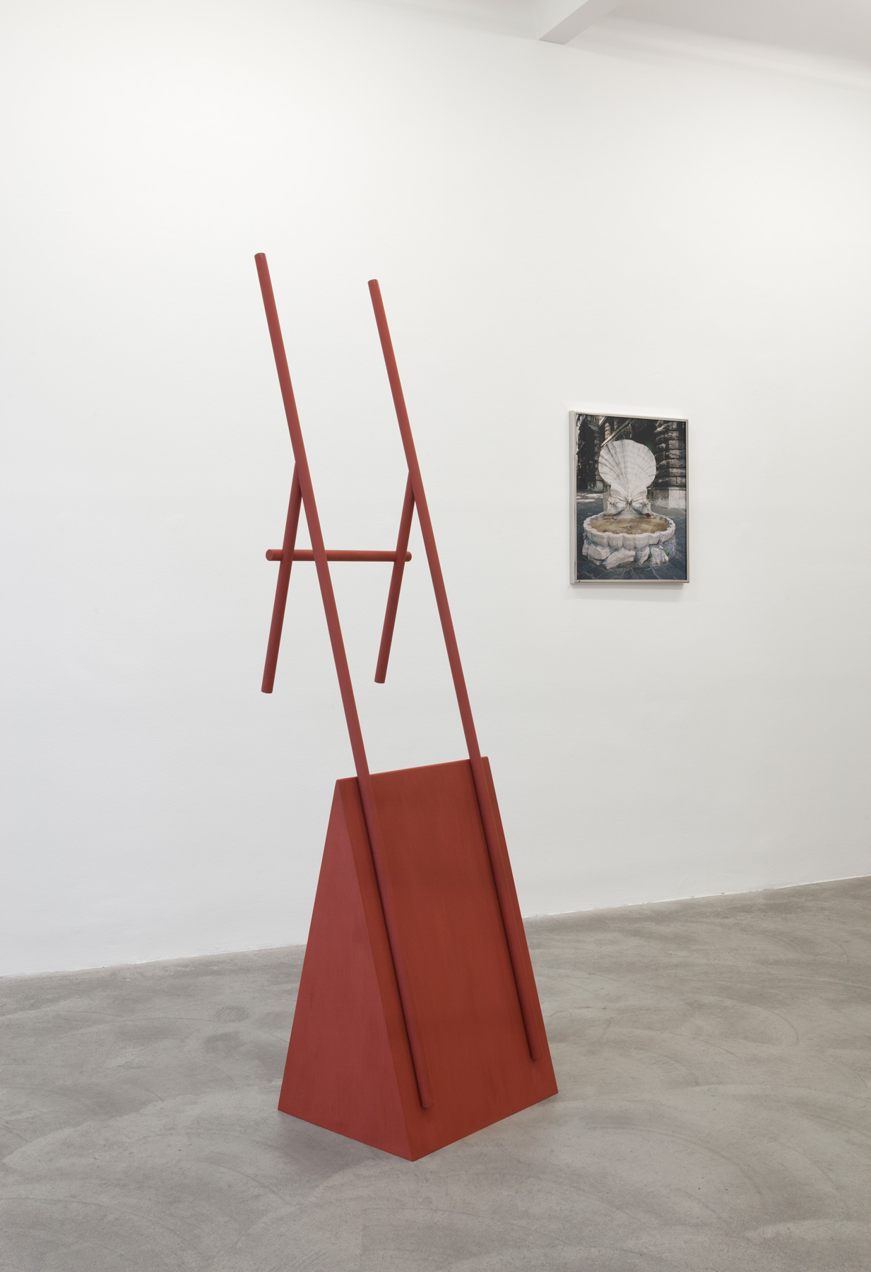 Employing an architectural scale, Feiersinger puts his object — like a bracket — in relation to a number of sculptures and in dialogue with his photographs, amongst others with a photo work depicting a holiday home in the late 1960s in Fregene. The many glass surfaces — edged by red metal frames, contrasting the exposed concrete — give the house its character. Feiersinger is fascinated both by the rawness and the delicacy of the building; the structure echoes in his sculpture. “Often, the forms just find me, I see something and take it with me. At some point it becomes important and can resurface as a fragment or part of an object.”
