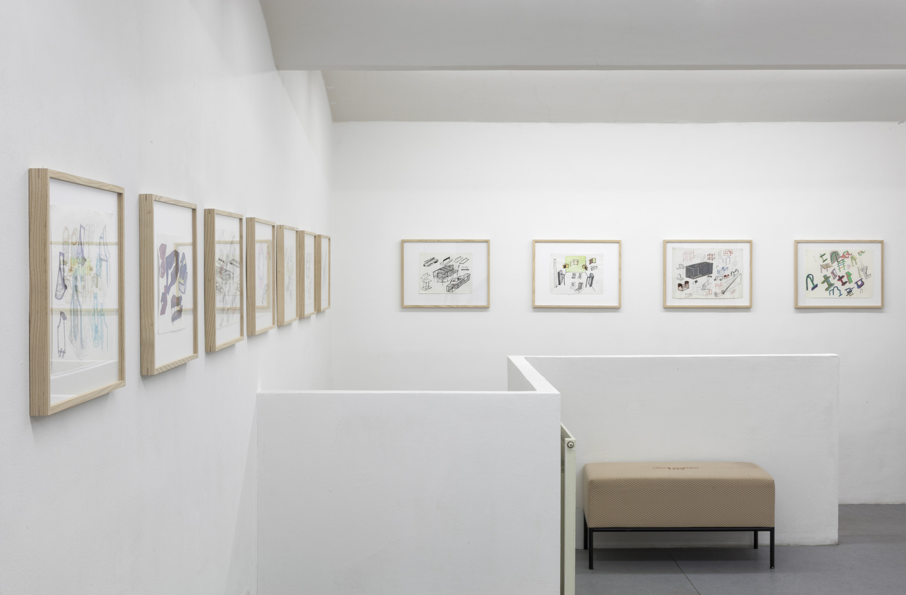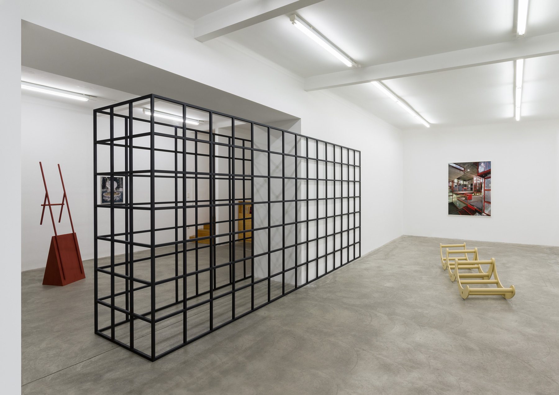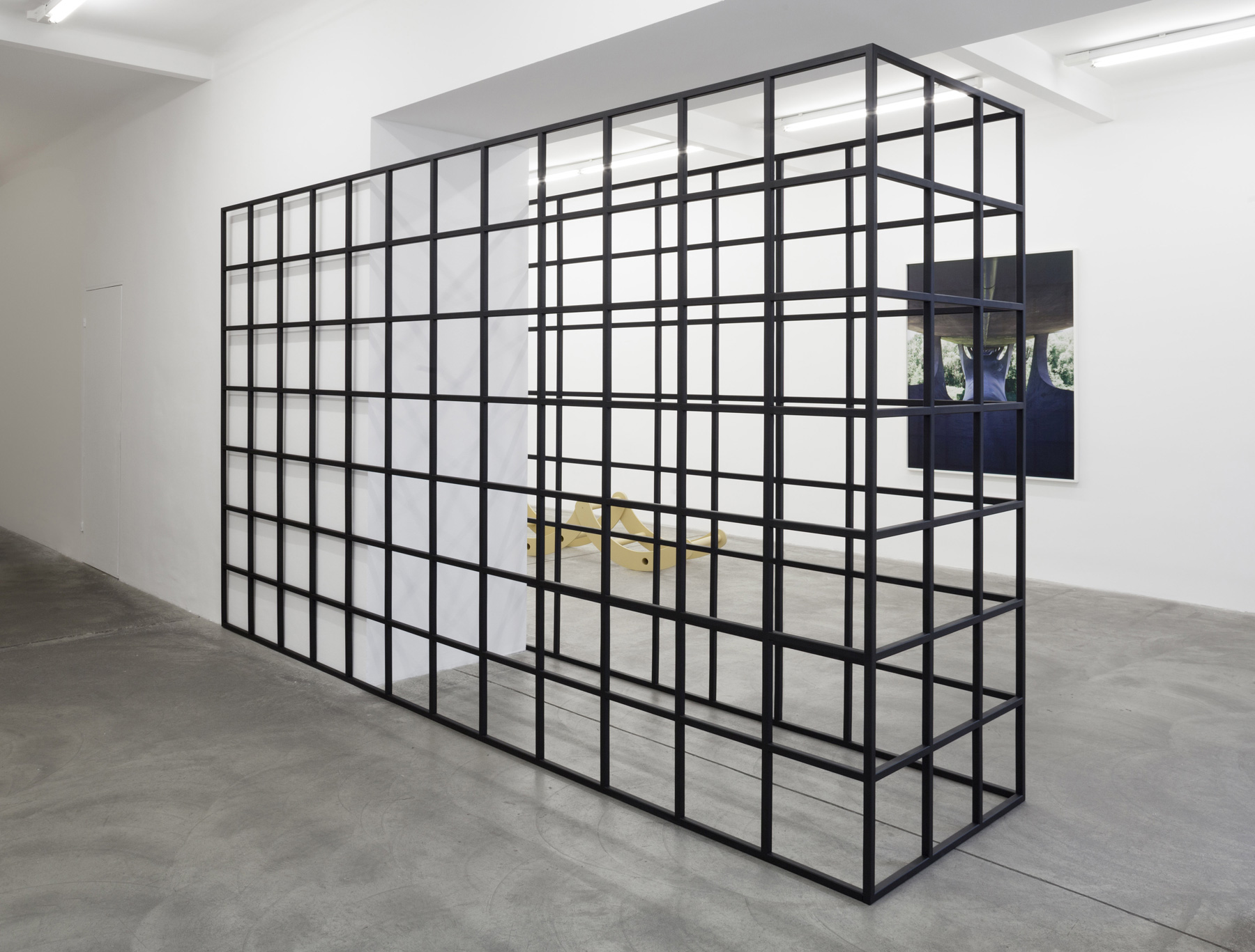 A black frame structure, 5 metres in length and 2.34 metres in height, stands on the gallery’s ground floor, dividing the exhibition space. The large-scale grid allows us to look through it and at the same time changes our playground, imposing a new movement pattern upon us. Feiersinger crafts all of his objects himself. The reduced surface treatment acts against the meticulousness he applies otherwise. The steel sculptures are coated with primers — the final coat is missing, the material fades into the background.