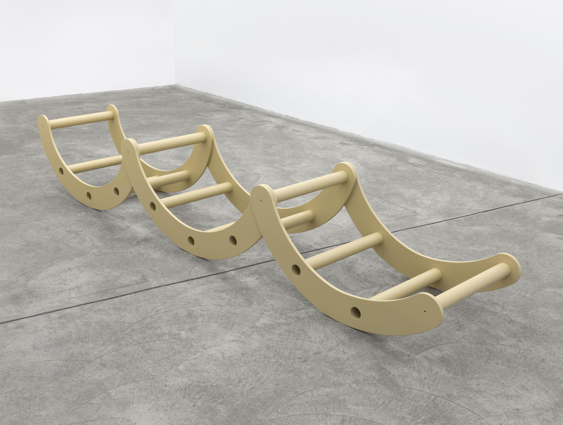 A curved ladder object, primed beige, rests on the floor. Having been transformed from a level of functionality to playfulness, it can no longer be utilised. Just like a wave dancing in a room, it is free of any functionality.