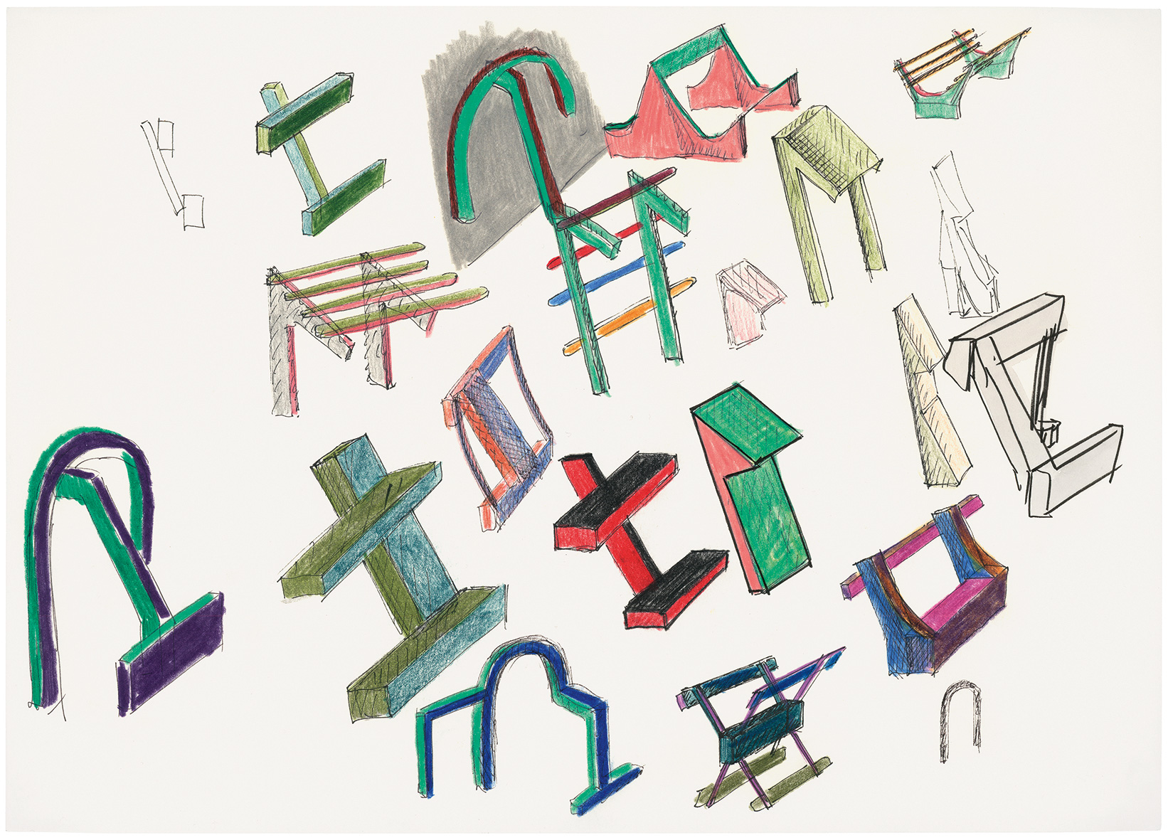 Sign-like, individual sculptures are placed across the exhibition space: A seemingly fragmentary construction with a red brown coat is well-anchored on its wedge-shaped heavy pedestal; it might look like an object of utility, but it defies all functionality. Two chair-like objects, one green the other black, invite us to put ourselves in relation to them. However, there are no seating surfaces and hence no means of utilisation. “This reference to utility value, followed by its denial, makes Feiersinger’s sculptures comical and uncanny at the same time.” (Jörg Heiser)