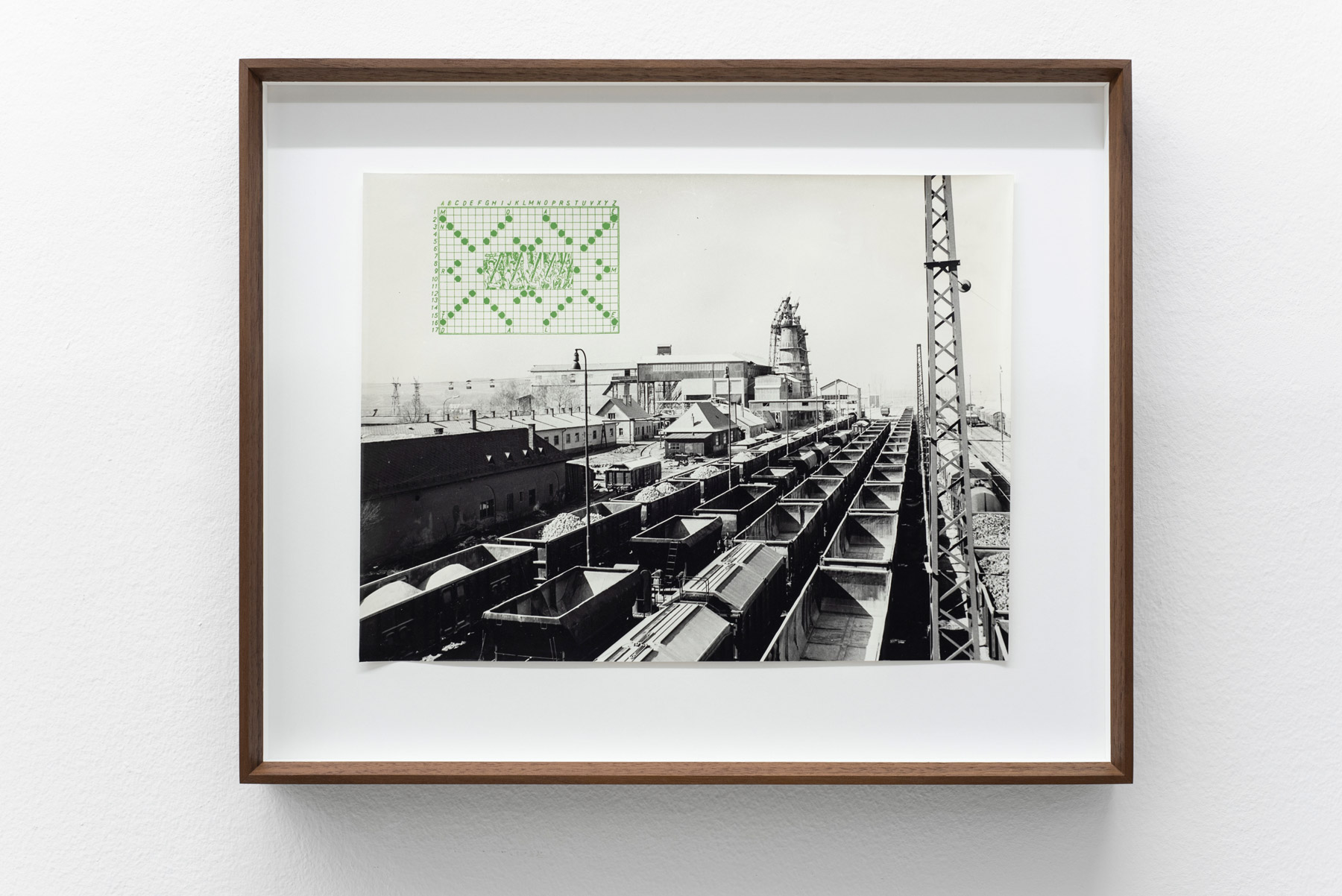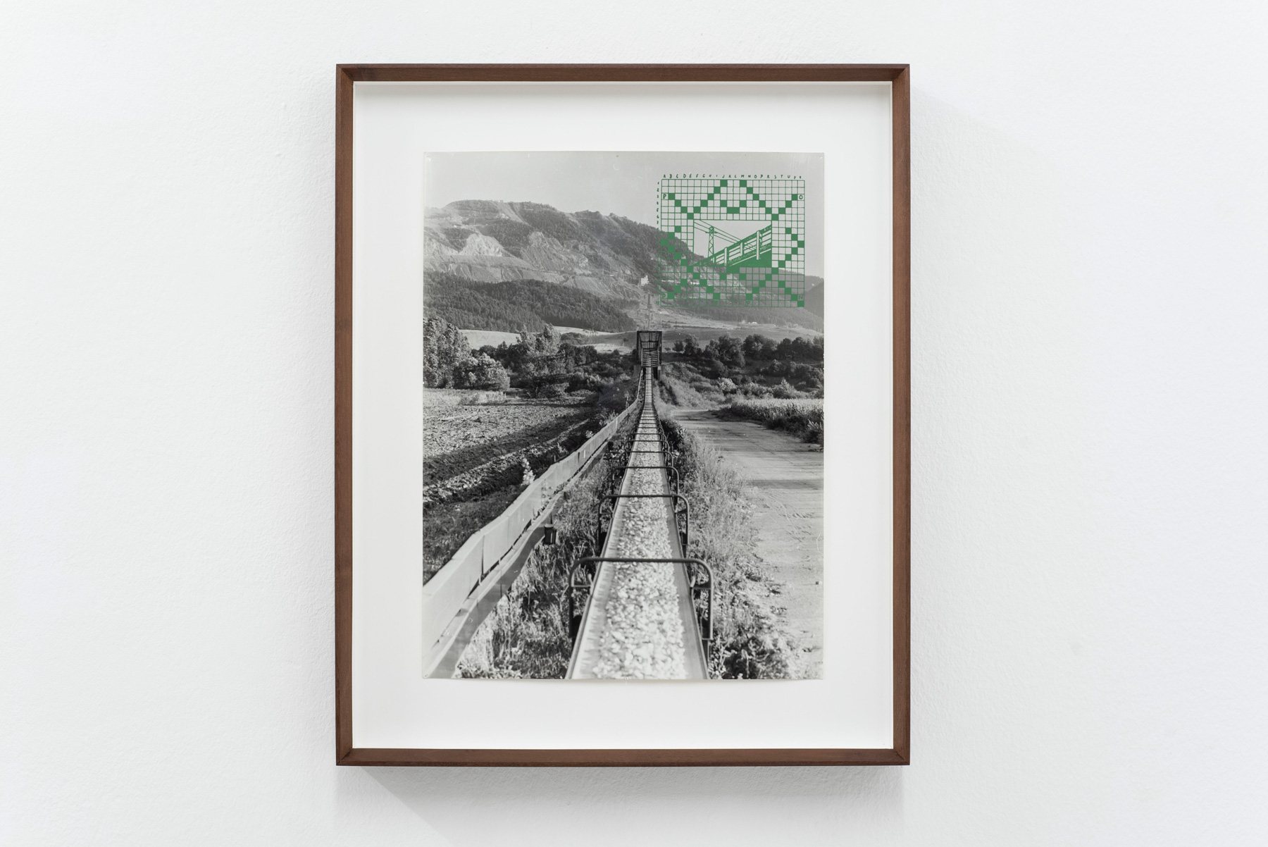 For this new revival of the work, Ondak offers viewers an opening by pairing the installation with a series of works overlaying photographs of the quarry where his father worked with silkscreens of ornate crossword puzzles excerpted from youth magazines of the late 1940s. If the photographs are not exactly postcard-ready, they do bear the intonation of industrial optimism that could be found in that early propaganda. The crosswords are highly graphic, incorporating illustrations and deliberate patterning that Ondak playfully rhymes with the technical elements from the photographs. The artist purposefully excludes the puzzle clues, so that the blanks share the same suspended state of the blacked-out postcard: illegible and yet full of possibility.